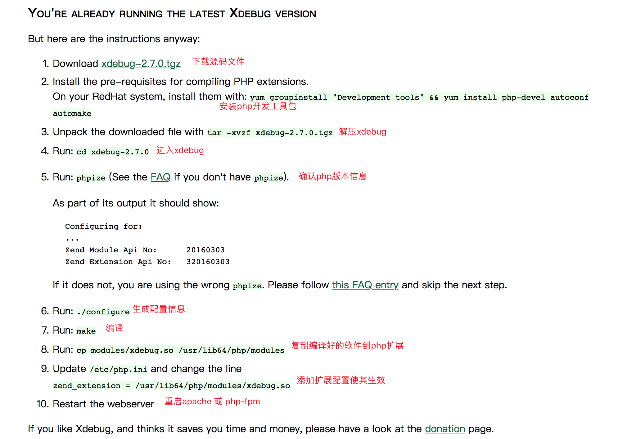 网上可以很轻易的搜到安装教程,大体的步骤基本上就是:获取phpinfo信息,根据phpinfo信息安装php开发工具包,下载xdebug源码、编辑安装,修复php.ini文件启用xdebug。