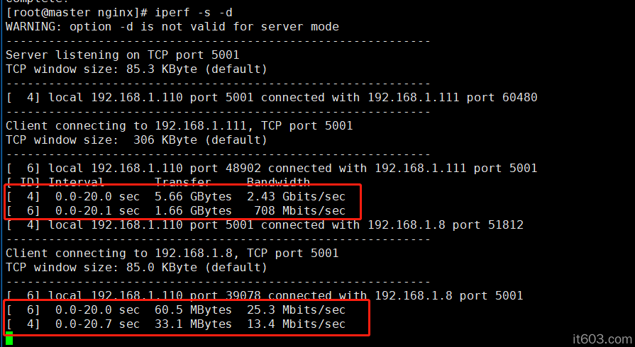 客户端:iperf -c 192.168.100.55 -t 20 -i 2 -d -m
