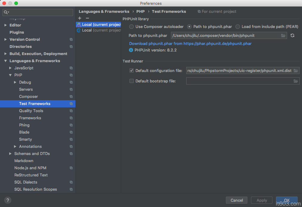 setting->test Frameworks ->添加一箇phpunit local,選擇對應的安裝方式以及路徑