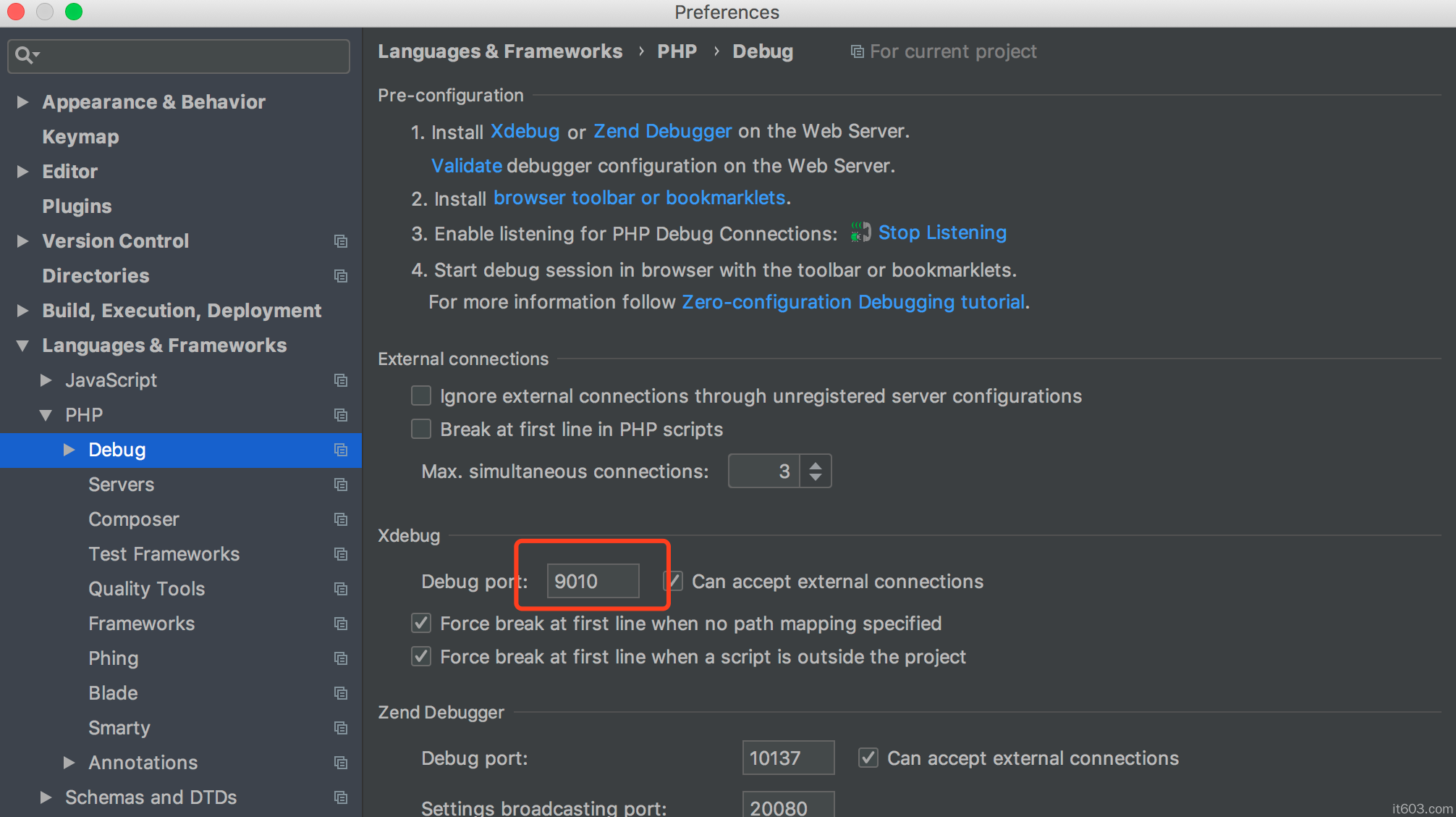 1、設置xdebug監聽端口,preference或setting內
