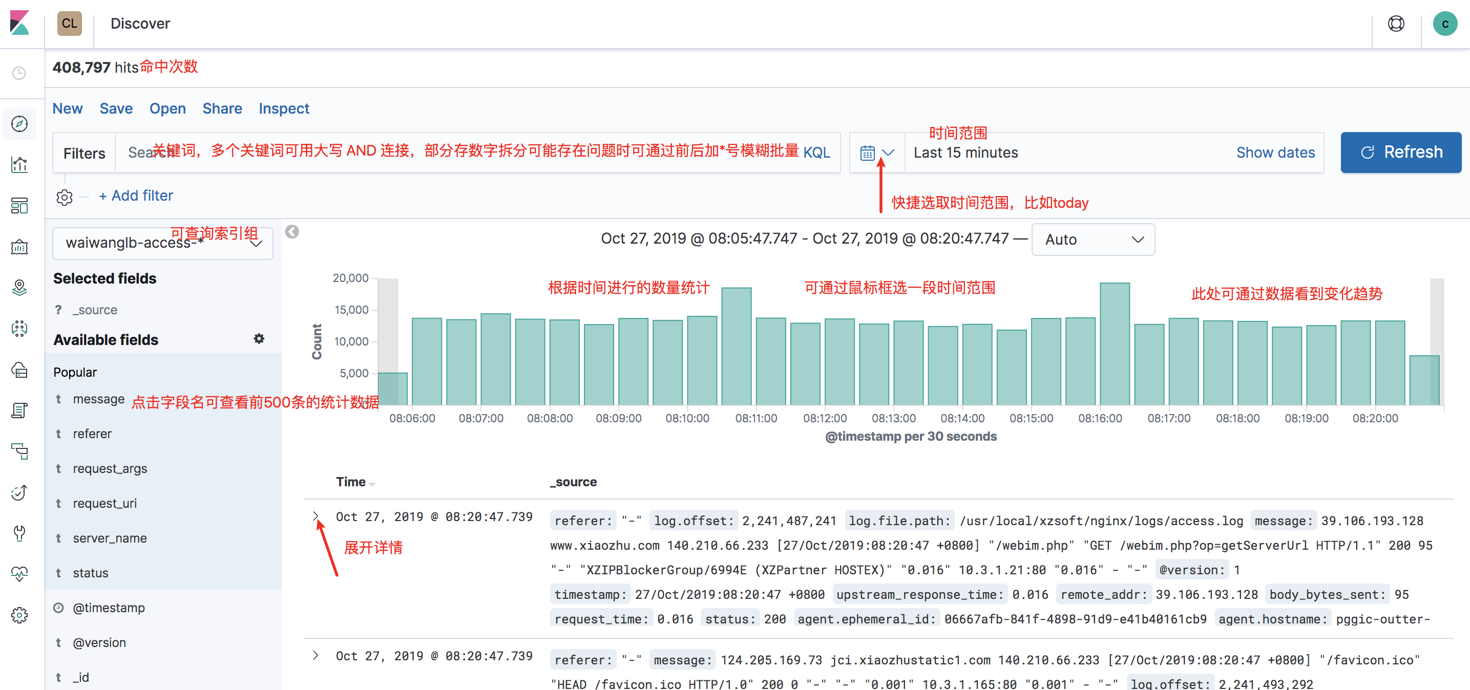 kibana內置大量統計功能,可以很簡單的實現日誌統計分析、大屏數據展示等。比如數量、平均值、衕比、環比等。可以幫助我們髮現一些趨勢變化。